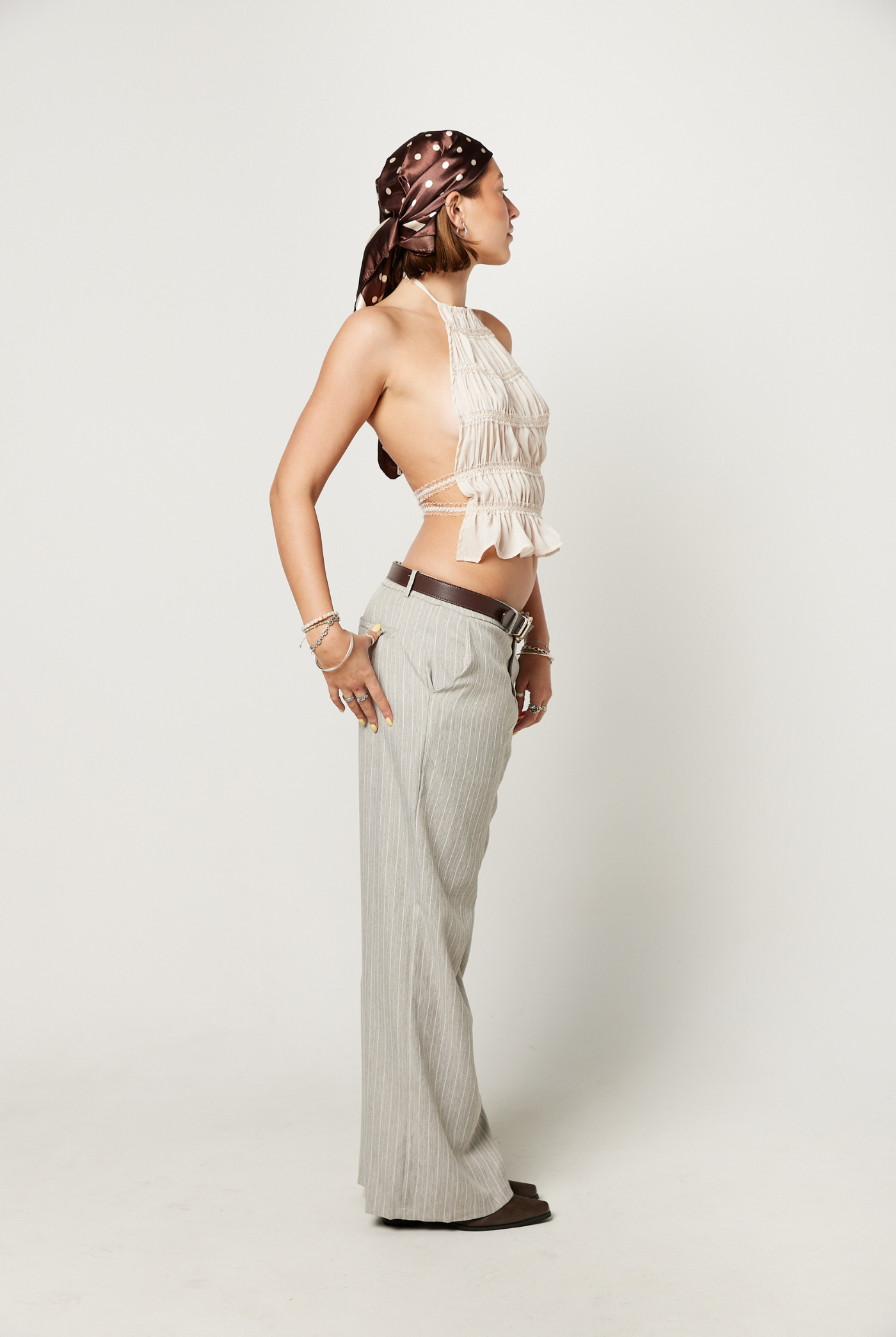 Pair it with wide leg pants for a modern streetwear edge or layer under a blazer for a chic evening look. The Brooke Halter embodies Never Trev’s take on minimal styling with maximum impact.